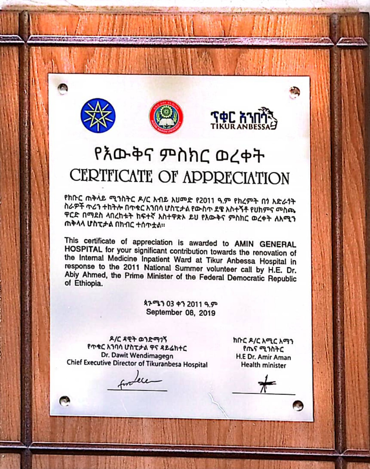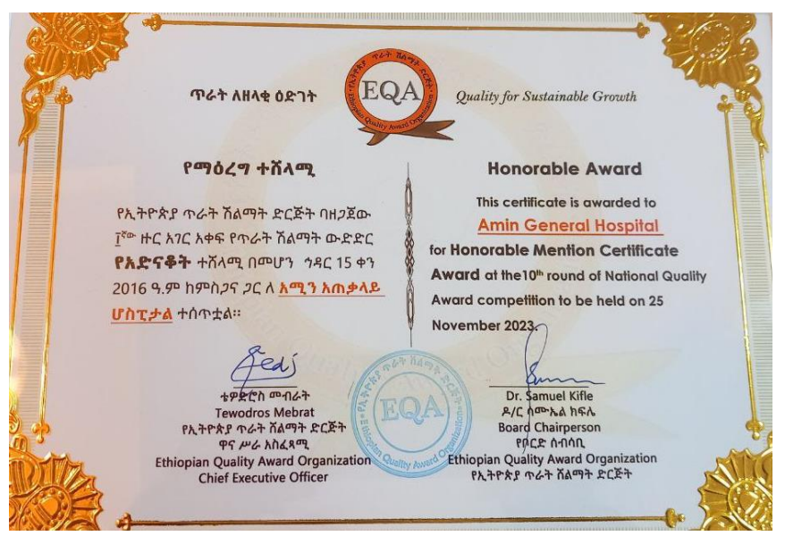 Recognition Certificate and Award: It means Amin general hospital is committed to being a top performing hospital and ensuring the best patient care and overall experience for its patients.